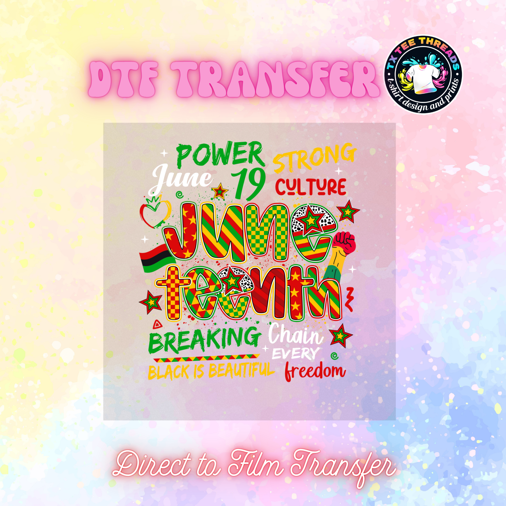 We use premium Direct to Film (DTF) prints that can be easily transferred to t-shirts, hoodies, tote bags, pillows, and more. These transfers are durable and stretchable, maintaining their quality even on stretchy fabrics.